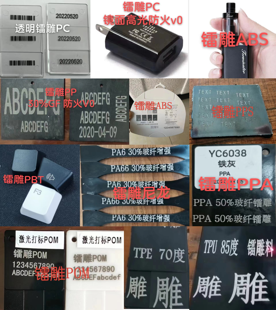 在塑擎的鐳雕產品線中,能用于鐳雕工藝中的塑膠材料種類很多,例如PA6、PA66、PPA、POM、PPS、透明PC、不透PC、ABS、TPE、TPU等。
